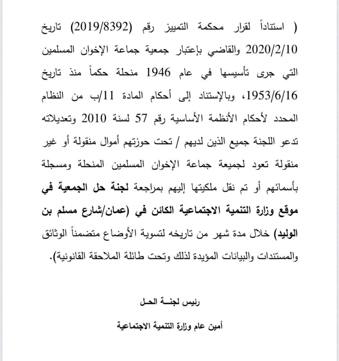 وتأتي هذه الدعوة استنادًا إلى قرار محكمة التمييز رقم (8392/2019) الصادر بتاريخ 10 شباط 2020، والذي قضى باعتبار جمعية جماعة الإخوان المسلمين، التي تأسست عام 1946، جمعية منحلة منذ تاريخ 16 حزيران 1953، وذلك بالاستناد إلى أحكام المادة 11/أ من النظام المحدد لأحكام الأنظمة الأساسية رقم 57 لسنة 2010 وتعديلاته.
