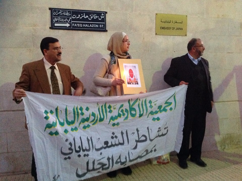 نفذ صحفيون ومتضامنون اليوم الإثنين وقفة أمام السفارة اليابانية في عمان، تضامنا مع الشعب الياباني، إثر مقتل صحفيين إثنين منه على يد تنظيم الدولة الإسلامية في العراق والشام أو ما يعرف "بداعش"، رافعين يافطات كتب عليها شعارات تضامنية مع الشعب الياباني.