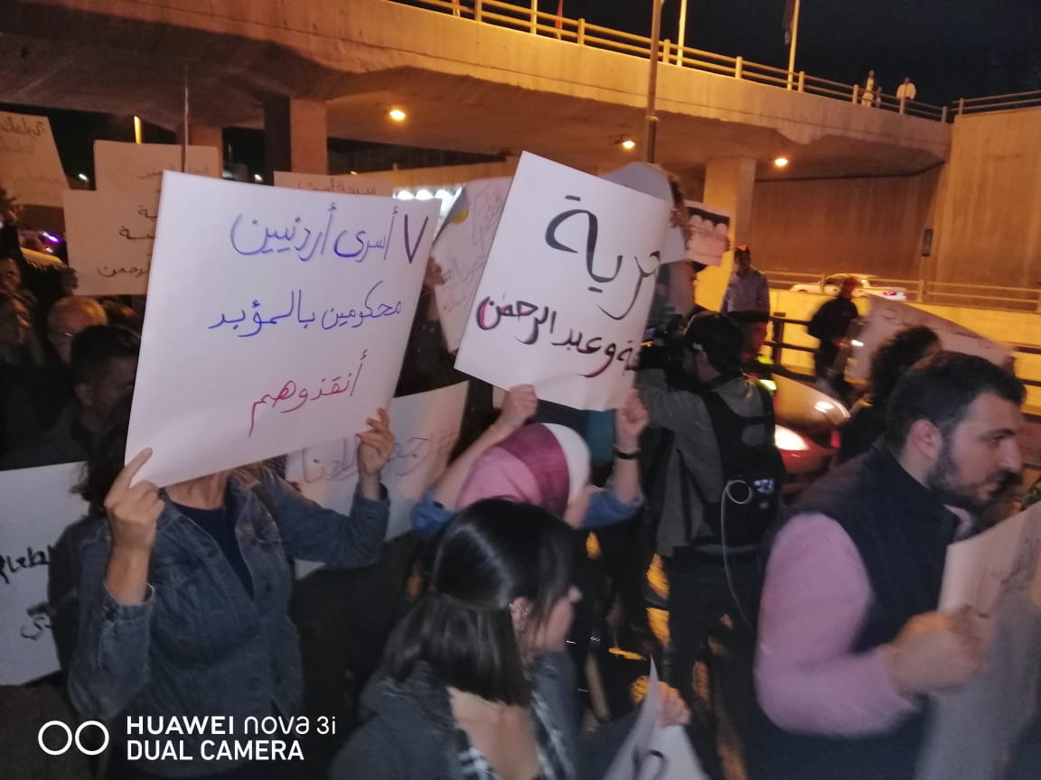 نفذت الحملة الشعبية لإطلاق هبة وعبد الرحمن بمشاركة عدد من أهالي الأسرى ومواطنين أردنيين وقفة تضامنية اما دار رئاسة الوزراء لمطالبة الحكومة باتخاذ اجراءات جادة وحاسمة لإطلاق سراح الأسيرين هبة اللبدي وعبد الرحمن مرعي وباقي الأسرى الأردنيين في سجون الإحتلال وعددهم ٢٣ اسيرا.
