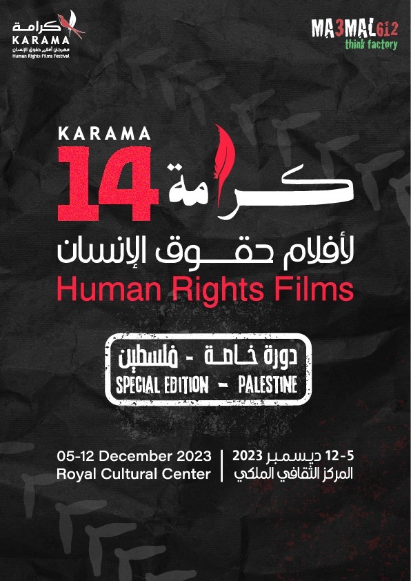 بشكل استثنائيٍّ تفاعليٍّ مخصصٍ (أساسًا) لِفلسطين وآلام شعبها ونضالاتهم وتطلعاتهم في الضفة والقطاع، تنطلق في السابعة من مساء اليوم (5 ديسمبر/ كانون الأول 2023)، في المركز الثقافي الملكي في العاصمة الأردنيّة عمّان، فعاليات الدورة 14 (دورة فلسطين) من مهرجان "كرامة لأفلام حقوق الإنسان"، متواصلةً حتى 12 الشهر الحالي (ديسمبر/ كانون الأول 2023).