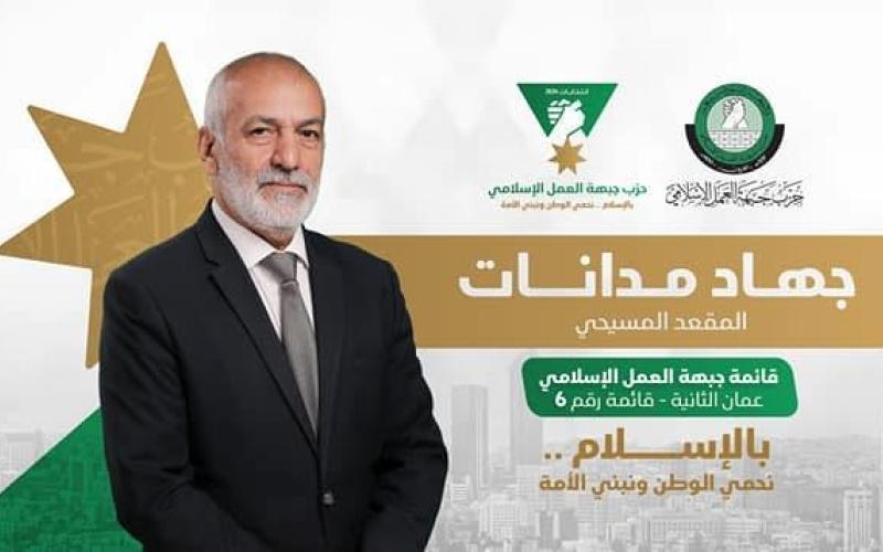 استنكر حزب جبهة العمل الإسلامي توقيف الأجهزة الأمنية لمرشحه عن المقعد المسيحي في قائمة الحزب في الدائرة الثانية في عمان جهاد المدانات أثناء توجهه مع أعضاء القائمة إلى مكتب الهيئة المستقلة للانتخابات لإتمام بعض الإجراءات المتعلقة بالعملية الانتخابية.