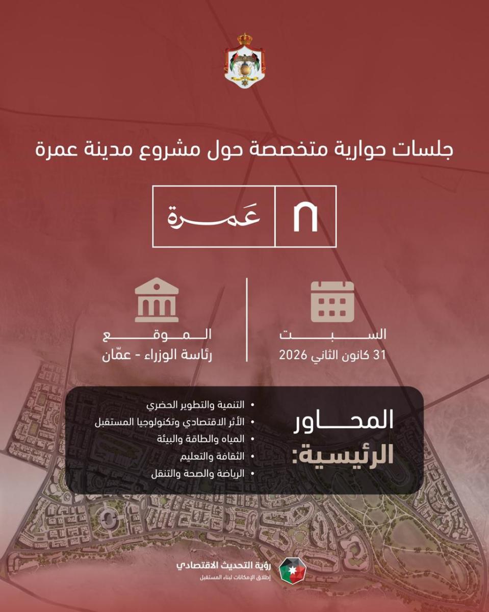 تُعقد في رئاسة الوزراء بعد غد السبت، جلسات حوارية متخصّصة؛ لمناقشة تطوير مشروع مدينة عمرة، يشارك فيها أكثر من 150 خبيراً من مختلف المجالات من الهندسة والتخطيط العمراني والحضري والبيئة والنقل إضافة إلى مختصين وأكاديميين في مجالات العمارة والطاقة والبيئة والمياه والاقتصاد والاستثمار وممثلين عن النَّقابات ذات العلاقة.