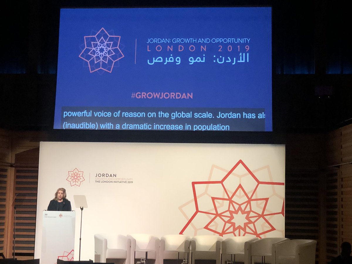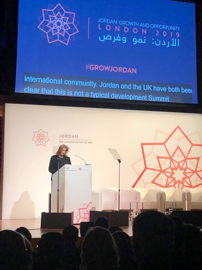 وأضافت في كلمتها أن “ازدهار الأردن له أهمية كبيرة للمجتمع الدولي، في منطقة موبوءة بالنزاعات”.