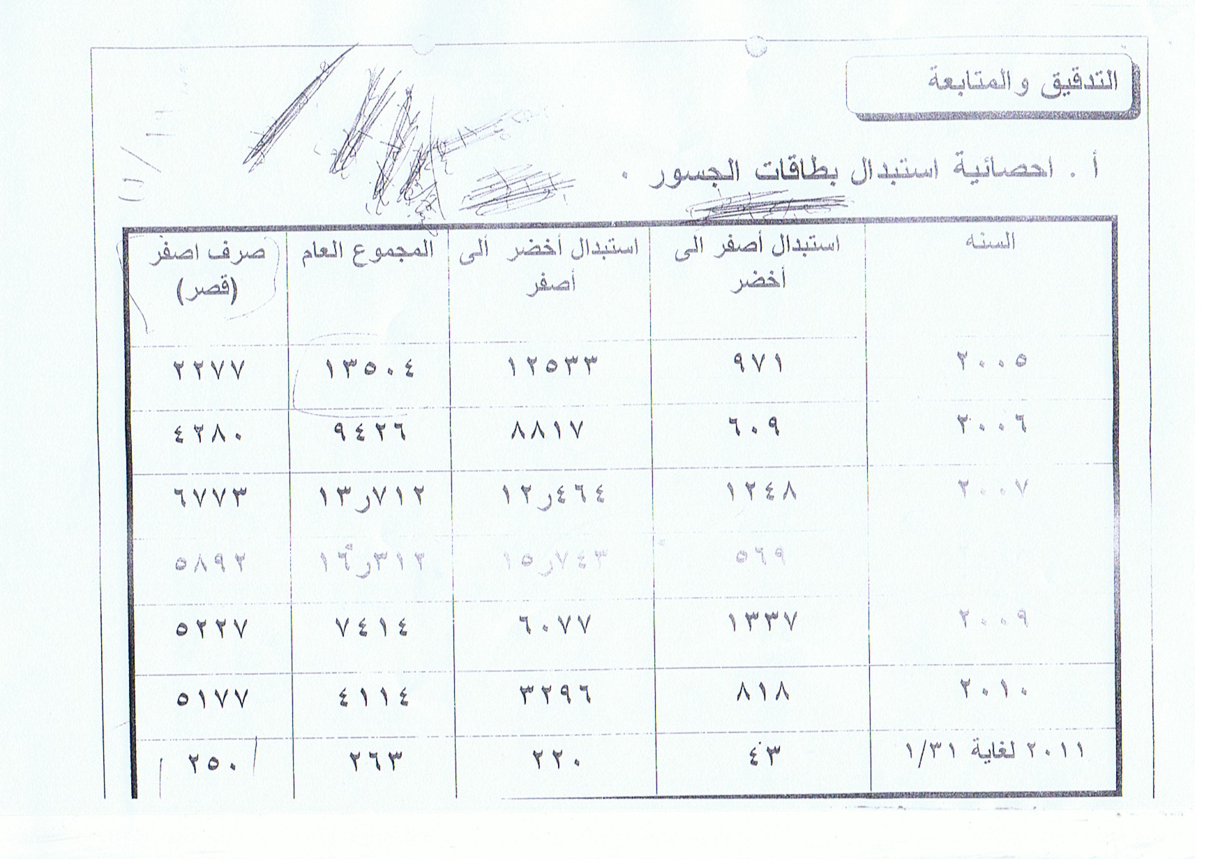 كما أظهرت أرقام وزارة الداخلية التي كشفت عنها لجنة فلسطين يوم اﻹثنين عن استبدال البطاقة الخضراء بالصفراء لـ64 ألفاً و745 شخصا من عام 2005 وحتى 31/1 2011؛ أي إرجاع اﻷرقام الوطنية لهم بعد تصويب أوضاعهم بتجديد تصريح الاحتلال. كما تم صرف بطاقة صفراء لـ29 ألفا و876 من القصر.