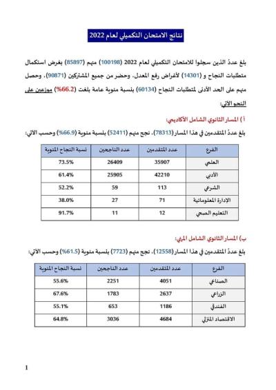 وأعلنت وزارة التربية والتعليم نتائج امتحان شهادة الدراسة الثانوية العامة لعام ٢٠٢٢ / الامتحان التكميلي، وذلك عبر الرابط الالكتروني www.Tawjihi.jo.