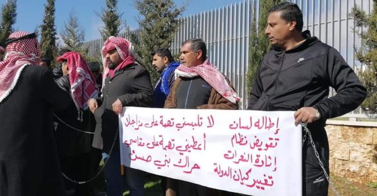 في خطوة احتجاجية قام العشرات من حراك أبناء قبيلة بني حسن اليوم الأربعاء بتقييد أنفسهم بالسلال أمام دائرة المخابرات العامة لتسليم أنفسهم دفعة واحدة إحتجاجاً على اعتقالات طالت أبناء حراك أبناء قبيلة بني