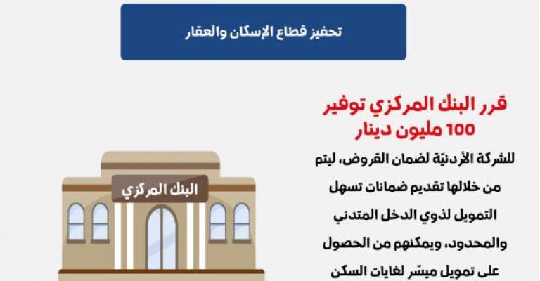 أعلن رئيس الوزراء الدكتور عمر الرزاز أن الشركة الأردنية لضمان القروض، ستوجه 100 مليون دينار للبنوك لدعم الأسر التي تسعى إلى الحصول على سكن. وقال الرزاز إن هذه الخطوة تساهم في خفض نسب الفائدة على