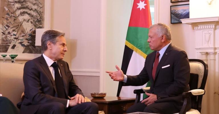 أكد الملك عبدالله الثاني خلال استقباله في عمان، اليوم الجمعة، وزير الخارجية الأمريكي أنتوني بلينكن ضرورة فتح ممرات إنسانية عاجلة لإدخال المساعدات الطبية والإغاثية إلى قطاع غزة، وأهمية حماية المدنيين