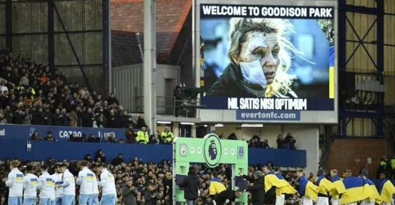 تضامن لاعبو مانشستر سيتي وإيفرتون، مع أوكرانيا التي تتعرض لغزو روسي، قبل انطلاق مباراتهما بالدوري الإنجليزي الممتاز. وارتدى لاعبو مانشستر سيتي، السبت، قمصان تحمل رسالة "لا للحرب"، بينما قام لاعبو فريق