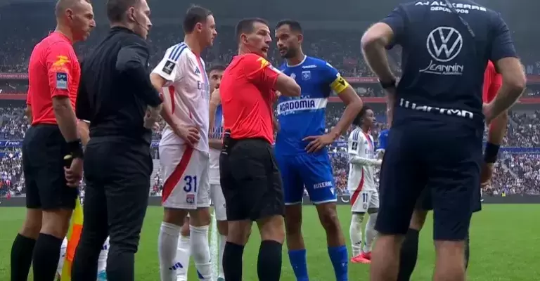 منح الحكم ركلة جزاء مثيرة للجدل لفريق ليون الفرنسي لكرة القدم مما دفع لاعبي ضيفه أوكسير إلى التوقف عن اللعب لعدة دقائق بطلب من مدربهم. بعد احتساب ركلة مرمى في البداية، استدعى حكم الفيديو المساعد