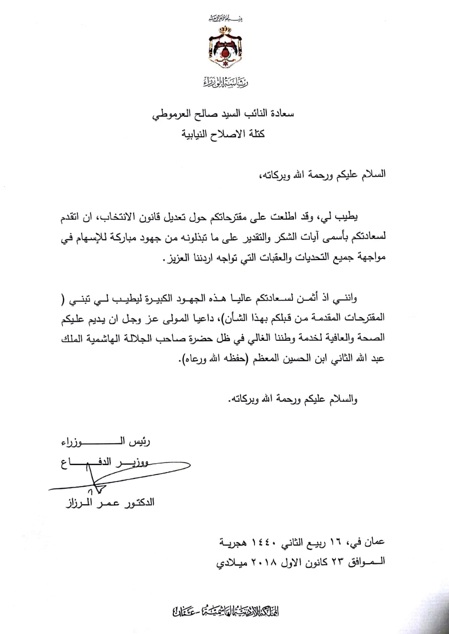 خاطب رئيس الوزراء الدكتور عمر الرزاز النائب صالح العرموطي (كتلة الإصلاح النيابية) بتبني المقترح المقدم منه والذي قدمته الكتلة لتعديل قانون الانتخابات النيابية.