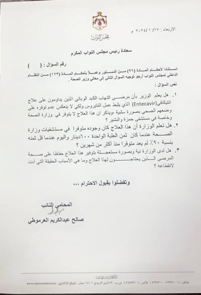 وجه النائب صالح العرموطي، امس الأربعاء، سؤال نيابي الى وزير الصحة، عن توفر علاج انتيكافي (Entecavir) في مستشفيات وزارة الصحة، وتاليا نص السؤال: