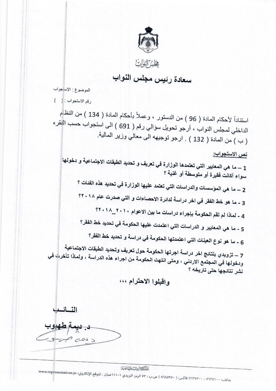 قالت النائب ديمة طهبوب أنها حولت سؤالها حول معدل دخل الفرد في الأردن ومستوى خط الفقر إلى استجواب.