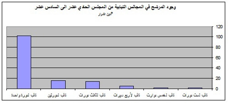 ويبين التقرير وجود النائب الأسبق عبد الكريم الدغمي في جميع المجالس النيابية منذ المجلس الحادي عشر في عام 1989 ولغاية المجلس السادس عشر 2012، بينما تواجد النائب السابق سعد هايل السرور في جميع المجالس النيابية باستثناء المجلس السادس عشر.