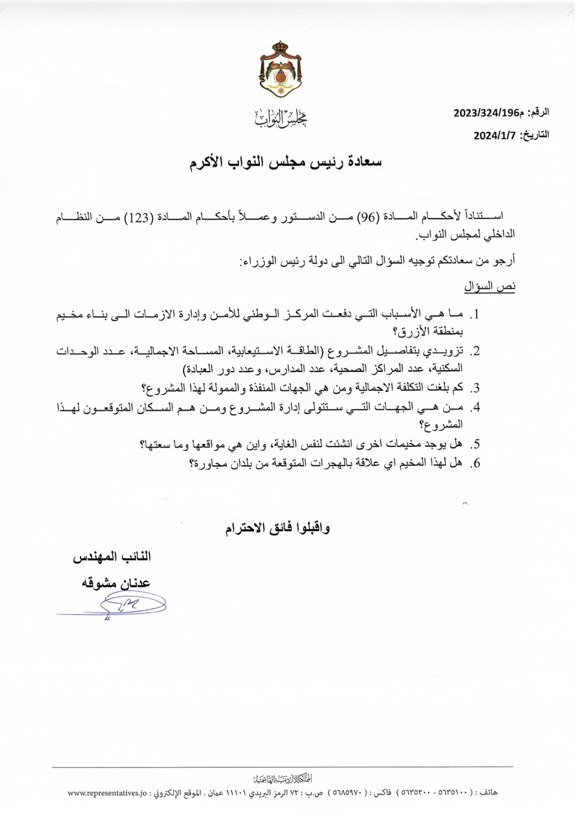 توجه النائب عدنان مشوقة اليوم، بسؤال نيابي الى رئيس الوزراء، وتسأل عن الأسباب التي دفعت المركز الوطني للأمن و إدارة الازمات الى بناء مخيم في منطقة الأزرق، وتكلفة المشروع والجهة الممولة، والطاقة الاستيعابية، وغيرها من التفاصيل، وتاليا نص السؤال النيابي: