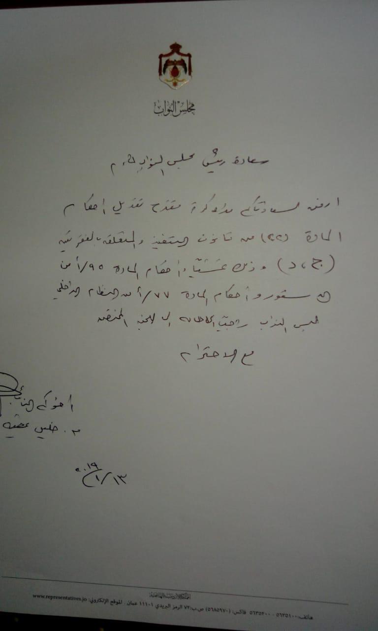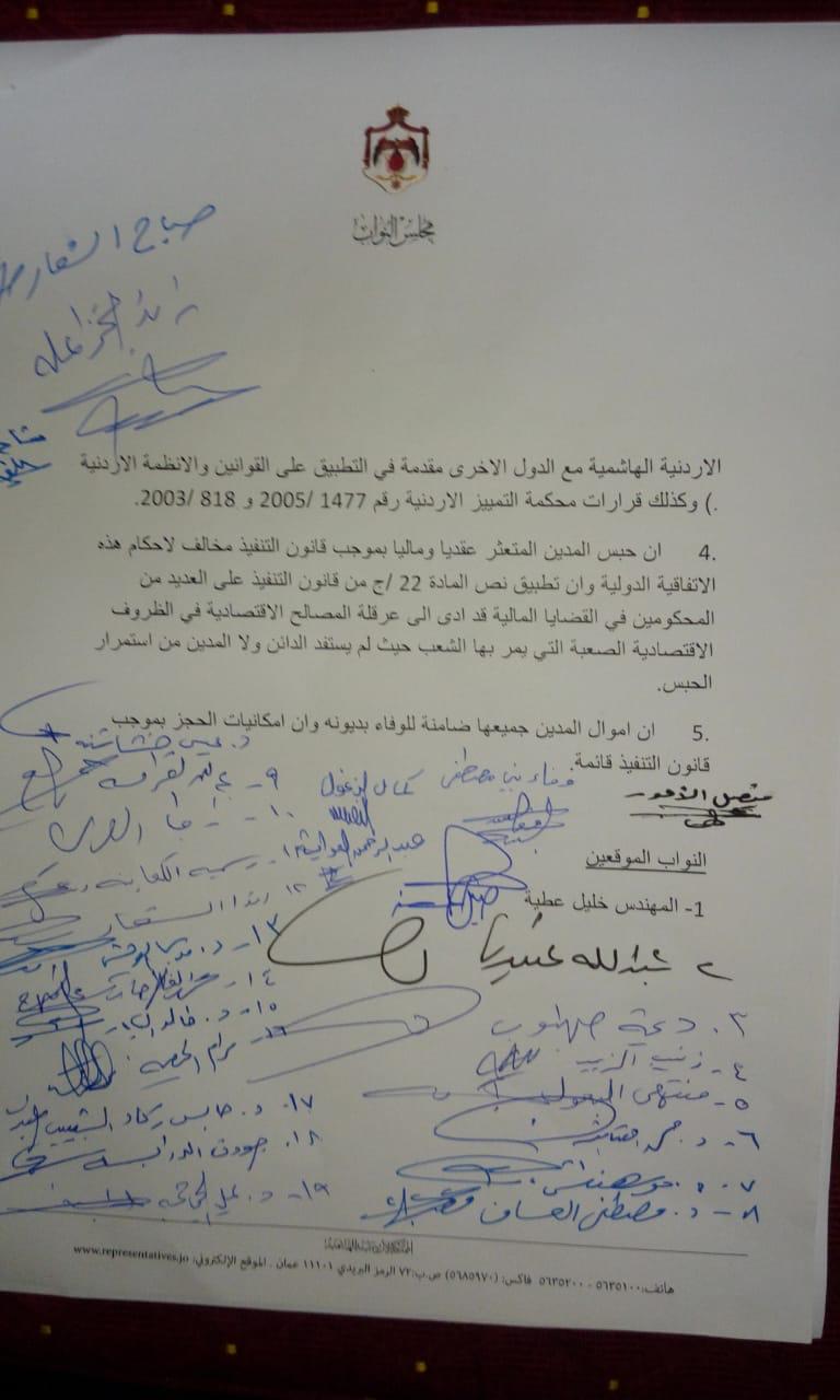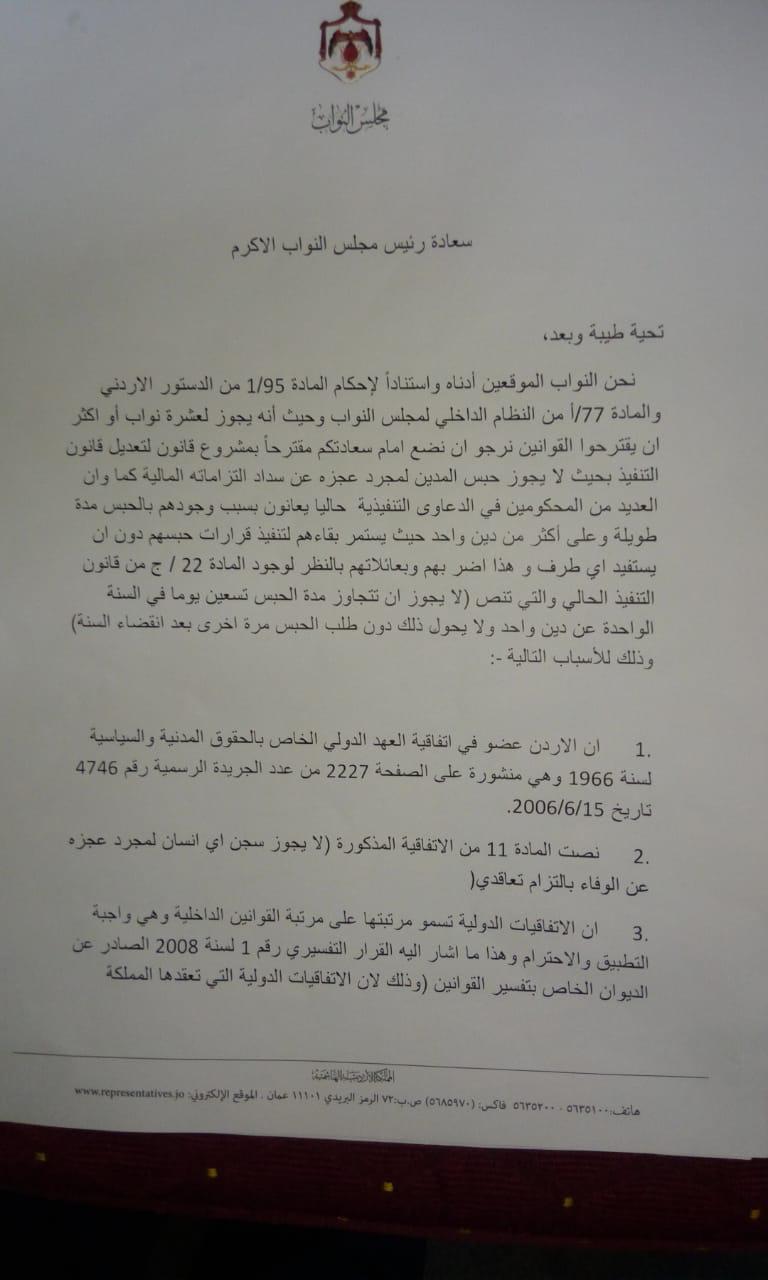 نحن النواب الموقعين أدناه واستناداً لاحكام المادة 95/1 من الدستور الاردني والمادة 77/أ من النظام الداخلي لمجلس النواب وحيث أنه يجوز لعشرة نواب أو اكثر ان يقترحوا القوانين نرجو ان نضع امام سعادتكم مقترحاً بمشروع قانون لتعديل قانون التنفيذ بحيث لا يجوز حبس المدين لمجرد عجزه عن سداد التزاماته المالية كما وان العديد من المحكومين في الدعاوى التنفيذية حاليا يعانون بسبب وجودهم بالحبس مدة طويلة وعلى أكثر من دين واحد حيث يستمر بقاءهم لتنفيذ قرارات حبسهم دون ان يستفيد اي طرف و هذا اضر بهم وبعائلاتهم بالنظر لوجود المادة 22 / ج من قانون التنفيذ الحالي والتي تنص (لا يجوز ان تتجاوز مدة الحبس تسعين يوما في السنة الواحدة عن دين واحد ولا يحول ذلك دون طلب الحبس مرة اخرى بعد انقضاء السنة) وذلك للأسباب التالية :-