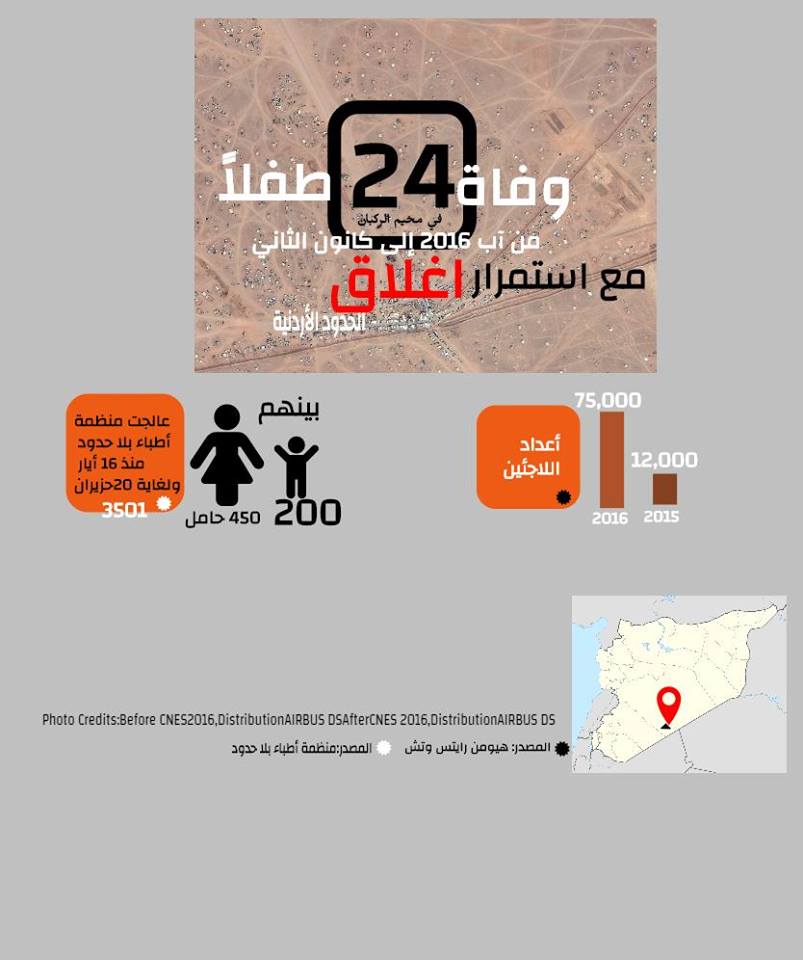 وأكدت منظمة أطباء بلا حدود، أنه بعد أن بدأت الأردن بتشديد إجراءاتها، ومن ثم إغلاق الحدود في 211 حزيران/ يونيو، لم تتمكن المنظمة من الوصول إلى هؤلاء الناس، ومنذ ذلك الحين هم محرومون من أية رعاية صحية، كما أنهم يحصلون على أقل من نصف كمية المياه اللازمة.