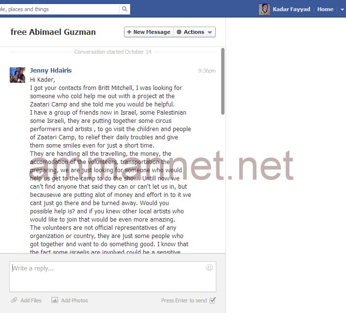 الناشطة السورية -قدر فياض- التي تشتغلُ بتقديم الدعم الإغاثي والنفسي للاجئين، عبرت عن موافقة مبدئية، على تسهيل مهمة الناشطين في تنفيذ برنامجهم الإغاثي داخل الزعتري، مرسلة لـ (هادريز) تستفسر عن تفاصيل البرنامج والقائمين عليه.