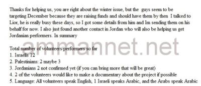المراسلات الطويلة التي تلت الكشف عن هوية الاسرائيليين العاملين في الاغاثة والتي اطلعت عليها " عمان نت"، عمدت جيني خلالها للتحفظ على اسماء الناشطين والجهات الاردنية التي عبرت عن رغبتها في التعاون لإنجاح الكرنفال، مؤكدة انه سبق لها تنفيذ برامج مشتركة مع الاسرائيليين.