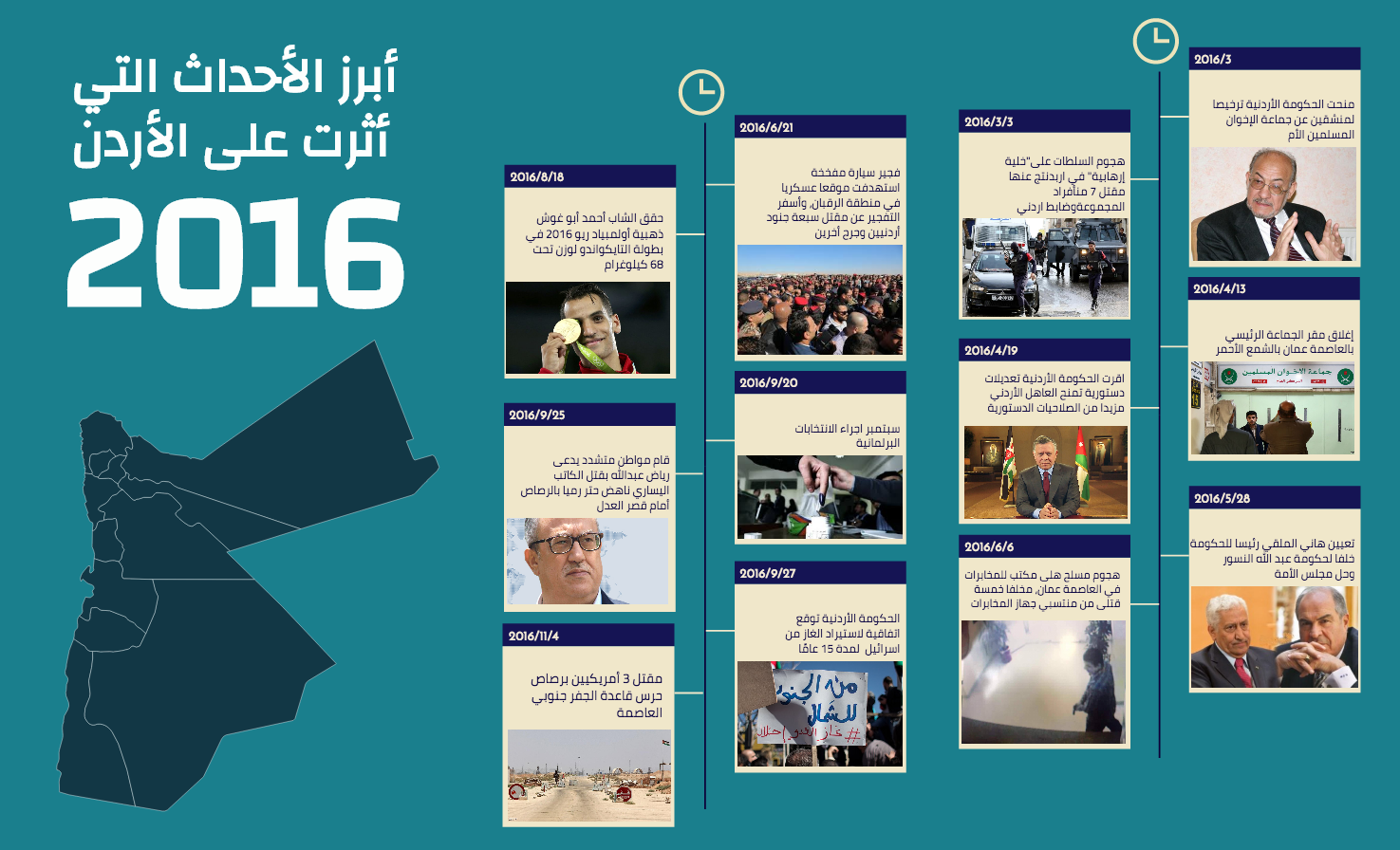 تمضي سنة 2016 ثقيلة الظل على الأردنيين؛ بعد أن خلفت أحداثا كبيرة على الصعيد الأمني والسياسي والإقتصادي، في مملكة تسبح بمحيط هائج، ضربت موجاته عمق المملكة مخلفة عددا من الضحايا في أحداث أمنية استهدفت مواقع عسكرية.