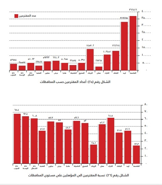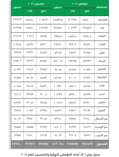 أما على صعيد أعداد المقترعين، فسجلت العاصمة أعلى عدد "362.416 مقترعا من أصل 1.557.385 مؤهلا للقتراع، تلتها محافظة اربد "319.278 مقترعا من أصل 748.752، فيما سجلت العقبة أقل عدد من المقترعين "23.817 مقترعا"، من أصل 55.819 مؤهلا.