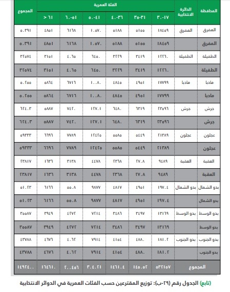 أظهر تقرير الهيئة المستقلة للانتخاب التفصيلي لمجريات العملية الانتخابية الأخيرة، أن أقـل نسـبة مشـاركة كانت للفئـة العمريـة "31-35" عاما بواقع 145.052 مقترعا، فيما سجلت الفئة العمرية "17-30" عاما أعلى نسبة مشاركة وبواقع 532.157 مقترعا، من إجمالي المقترعين البالغ 1.492.400 مقترع.