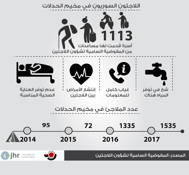 مسؤول المكتب الإعلامي في المفوضية السامية لشؤون اللاجئين، محمد الحواري، يؤكد تقديمهم المساعدات للاجئي للحدلات، حيث تم صرف مساعدات في الجولة الأولى استفادت منها قرابة 1100 أسرة، بانتظار صرف مساعدات الجولة الثانية.