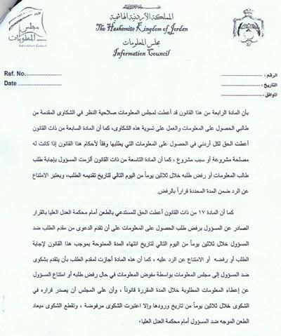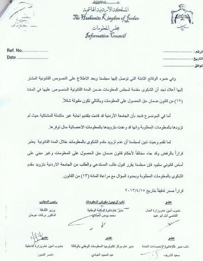 وقامت وﺣﺪة اﻟﺼﺤﺎﻓﺔ اﻻﺳﺘﻘﺼﺎﺋﻴﺔ بتحويل ﻗﺮار ﻣﺠﻠﺲ اﻟﻤﻌﻠﻮﻣﺎت اﻟﻤﻮﺻﻲ ﺑﻤﻨﺢ اﻟﻤﻌﻠﻮﻣﺔ ﻟﻠﺠﺎﻣﻌﺔ اﻷردﻳﻨﺔ إﻻ أن اﻟﺠﺎﻣﻌﺔ وﻋﺒﺮ ﻣﺳﺘﺸﺎر اﻟﺮﺋﻴﺲ اﻟﻘﺎﻧﻮﻧﻲ اﻟﻤﺤﺎﻣﻲ ﺳﻬﻴﻞ ﺣﺪادين أﺻﺮت ﻋﻠﻰ ﻋﺪم اﻟﺘﻌﺎون ﺑﺤﺠﺔ "ﻏﺰارة اﻟﻤﻌﻠﻮﻣﺎت اﻟﻤﻄﻠﻮﺑﺔ وﺗﺸﺘﺘﻬﺎ ﺑﻴﻦ اﻟﻜﻠﻴﺎت وﺳﺮﻳﺔ ﺑﻌﺾ ﻣﻨﻬا."