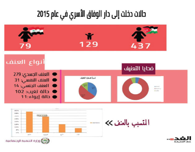 وبحسب آخر إحصائية لوزارة التنمية الاجتماعية، فإن “نسبة الأردنيات المعنفات بلغت 82.2 %، والعربيات 15.43 % غالبيتهن من السوريات، أما الجنسيات الأخرى فبلغت نسبتهن 2.36 %”.