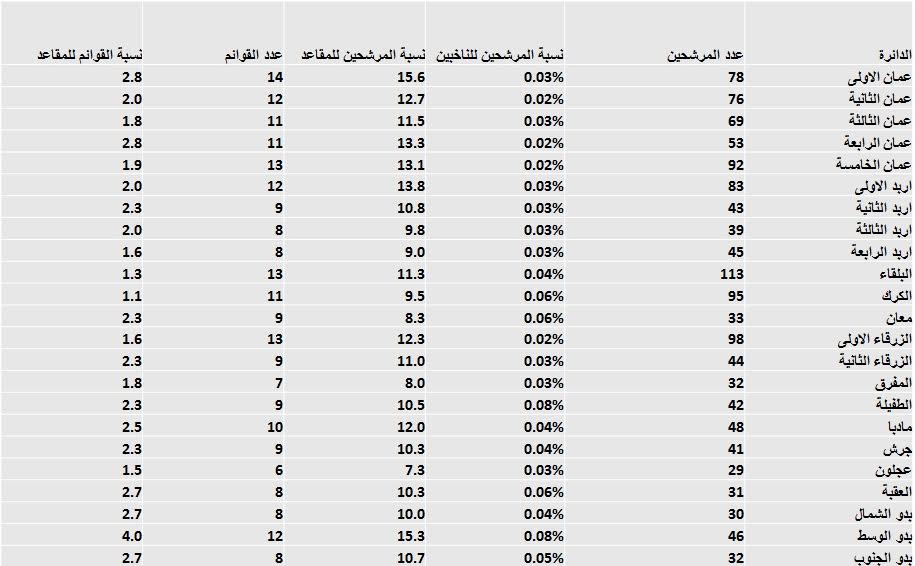 نسبيا سجلت دائرة بدو الشمال النسبة الاعلى للمرشحات حيث بلغت النسبة 36.7% من اجمالي عدد المرشحين في الدائرة، وتم تسجيل اقل نسبة في الدائرة الاولى في اربد حيث بلغت 15.7% من اجمالي المرشحين.
