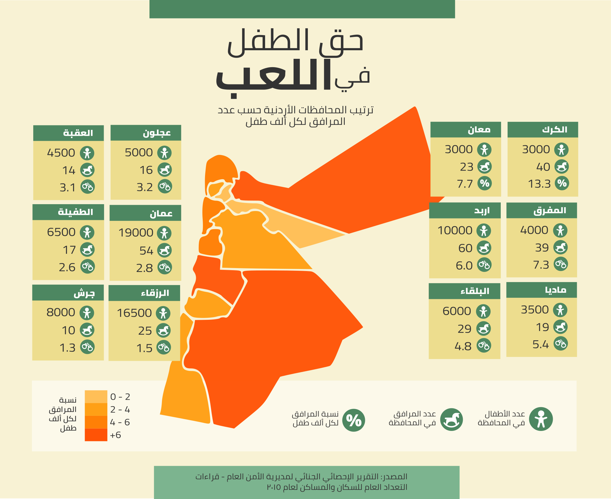 وحول التزام الأردن بتعهداته الدولية بشأن توفير مرافق ترفيه تضمن حق اللعب للأطفال، قال الناطق باسم وزارة التنمية الاجتماعية الدكتور فواز الرطروط إن "هذا الموضوع لا تستطيع الوزارة قياسه بمفردها فهو يحتاج لقياس من كافة المؤسسات والوزارات المعنية والمهتمة ومن بينها وزارة الشباب".