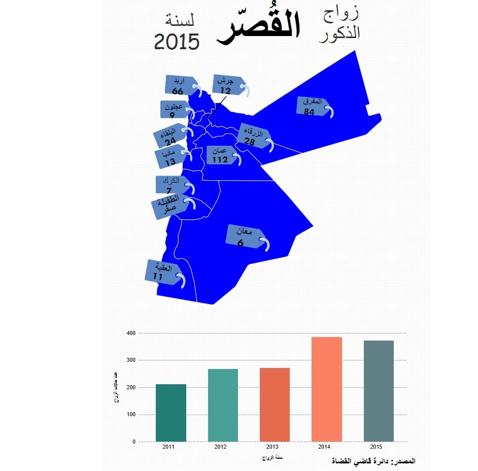 جمعية معهد تضامن النساء الأردني بدورها أشارت الى أن عدد الأزواج الذين تقل أعمارهم عن 18 عاماً بلغوا 386 زوجا خلال عام 2014 ، علماً بأن أغلب حالات الزواج التي يكون فيها عمر الزوج أقل من18 عاماً يكون عمر الزوجة أيضاً أقل من 18 عاماً أيضاً.