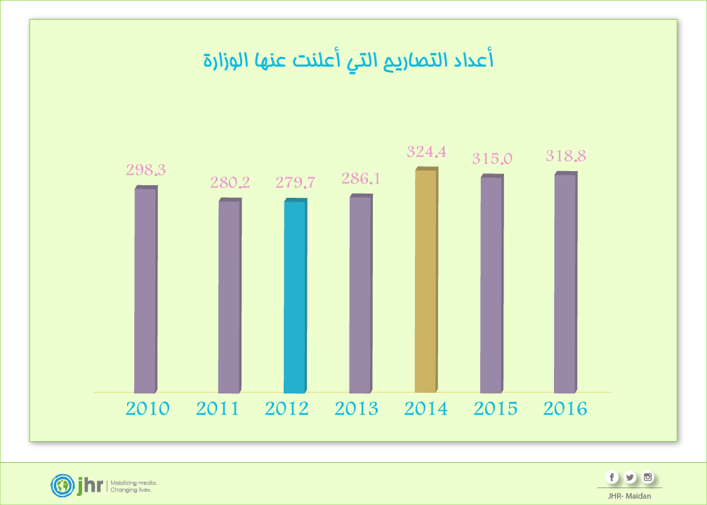 ويوضح الشكل أدناه مقدار تصاريح العمل التي أعلنت عنها الوزارة في الفترة المتدة من عام (2010-2016)، حيث يبين الشكل زيادة خلال العامين الأخيرين مقارنة بباقي الأعوام.