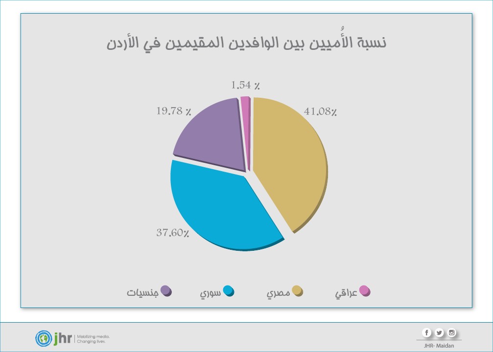 تظهر بيانات الإحصاءات العامة أن هناك مشكلة في نسبة الذين لا يقرأون ولا يكتبون بين الجنسيات المقيمة في الأردن، سواء بشكل رسمي أو غير ذلك، حيث أظهرت الأرقام أن ما نسبته "24%" من الجنسية المصرية المقيمين في الأردن لا يعرفون القراءة ولا الكتابة.