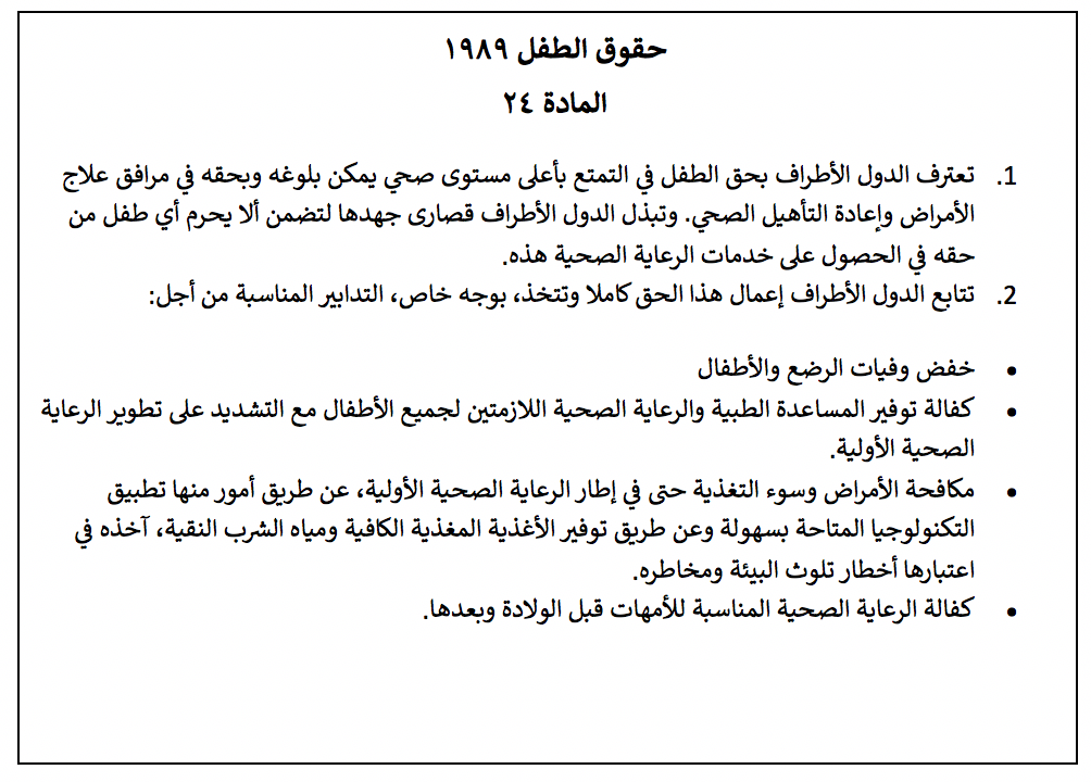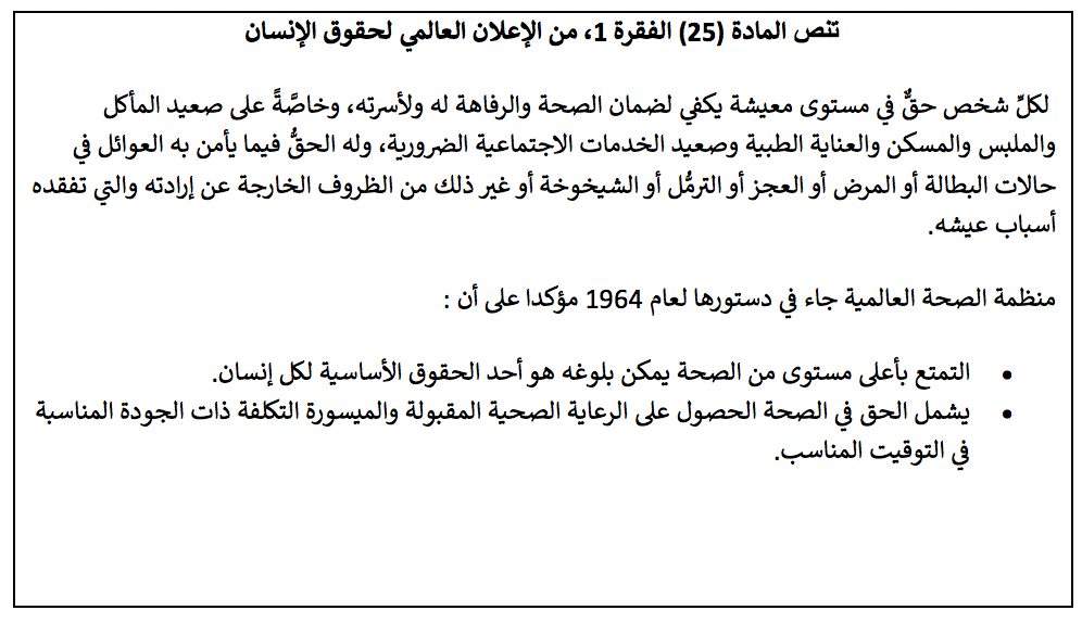 وتعرف منظمة الصحة العالمية الحق في الصحة أن “الحكومات يجب أن تهيئ الظروف التي يمكن فيها لكل فرد أن يكون موفور الصحة بقدر الإمكان. وتتراوح هذه الظروف بين ضمان توفير الخدمات الصحية وظروف العمل الصحية والمأمونة والإسكان الملائم والأطعمة المغذية.”