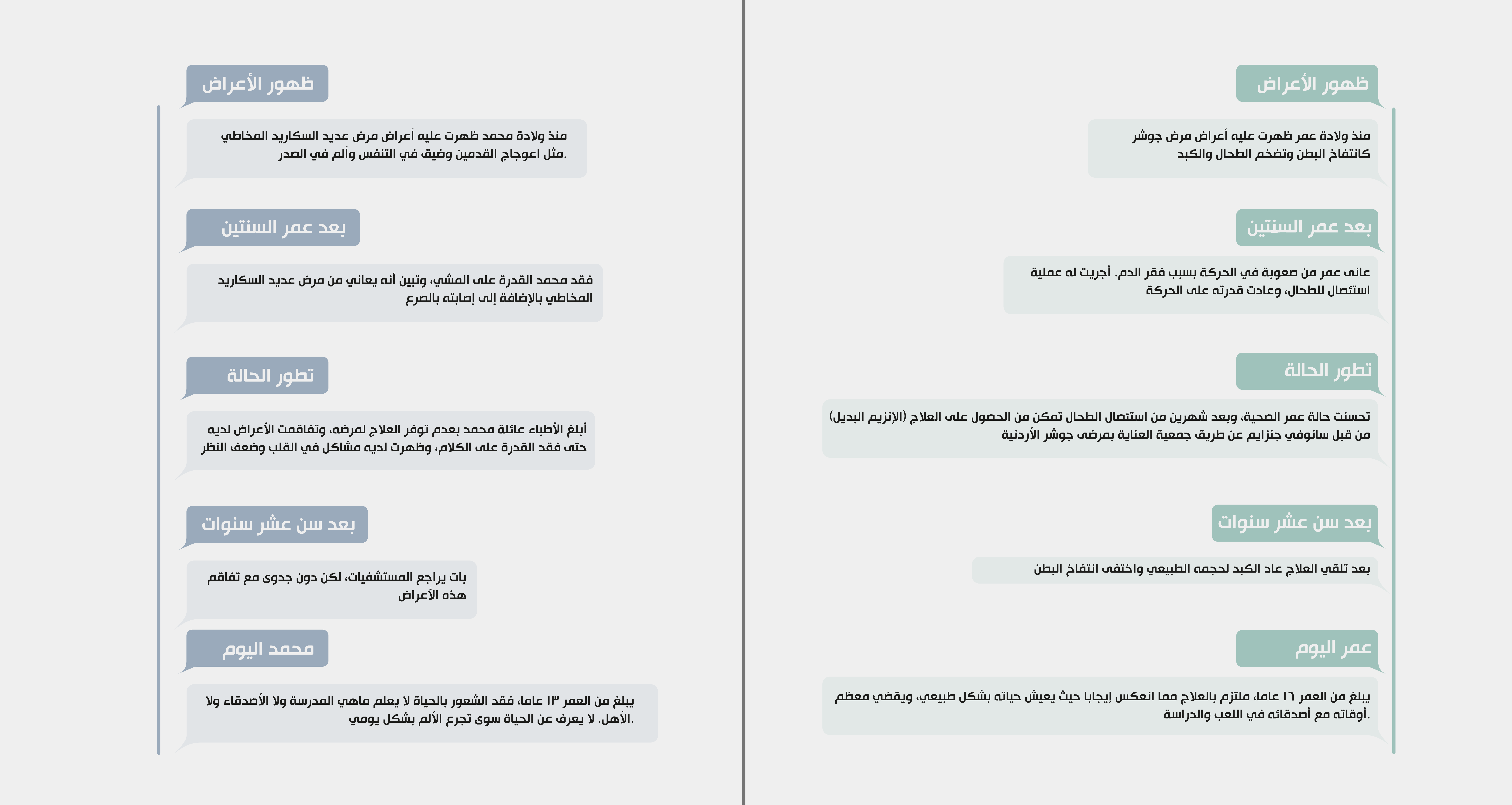 وترتبط حدة المرض بمدى نقص الإنزيم التعويضي، ولذا قد تظهر الأعراض في سنوات الطفولة وقد تتأخر إلى سنوات لاحقة. يعتبر أبو صلاح* اسم مستعار* (49 عاما) الحالة المقابلة لحالة أسرة أحمد وثائر وثراء. فالأب هنا هو المصاب بالمرض. وهو الأكبر سنا بين الأردنيين المصابين بتلك الأمراض بحسب بيانات جمعية الأمراض الوراثية التخزينية النادرة. على مدى عقود من حياته كان يشكو من دوار بين الحين والآخر وآلام في الجسم. اعتاد زيارة الأطباء الذين وصفوا له مسكنات ومضادات حيوية لتخفيف الألم. تزوج وأنجب أربعة أطفال وواصل حياته العملية “كصاحب مصانع لمواد التنظيف والعطور” حسبما أفاد. لكن في الخامسة والأربعين اشتدت معاناته من تضخم االطحال والكبد وهشاشة العظام.