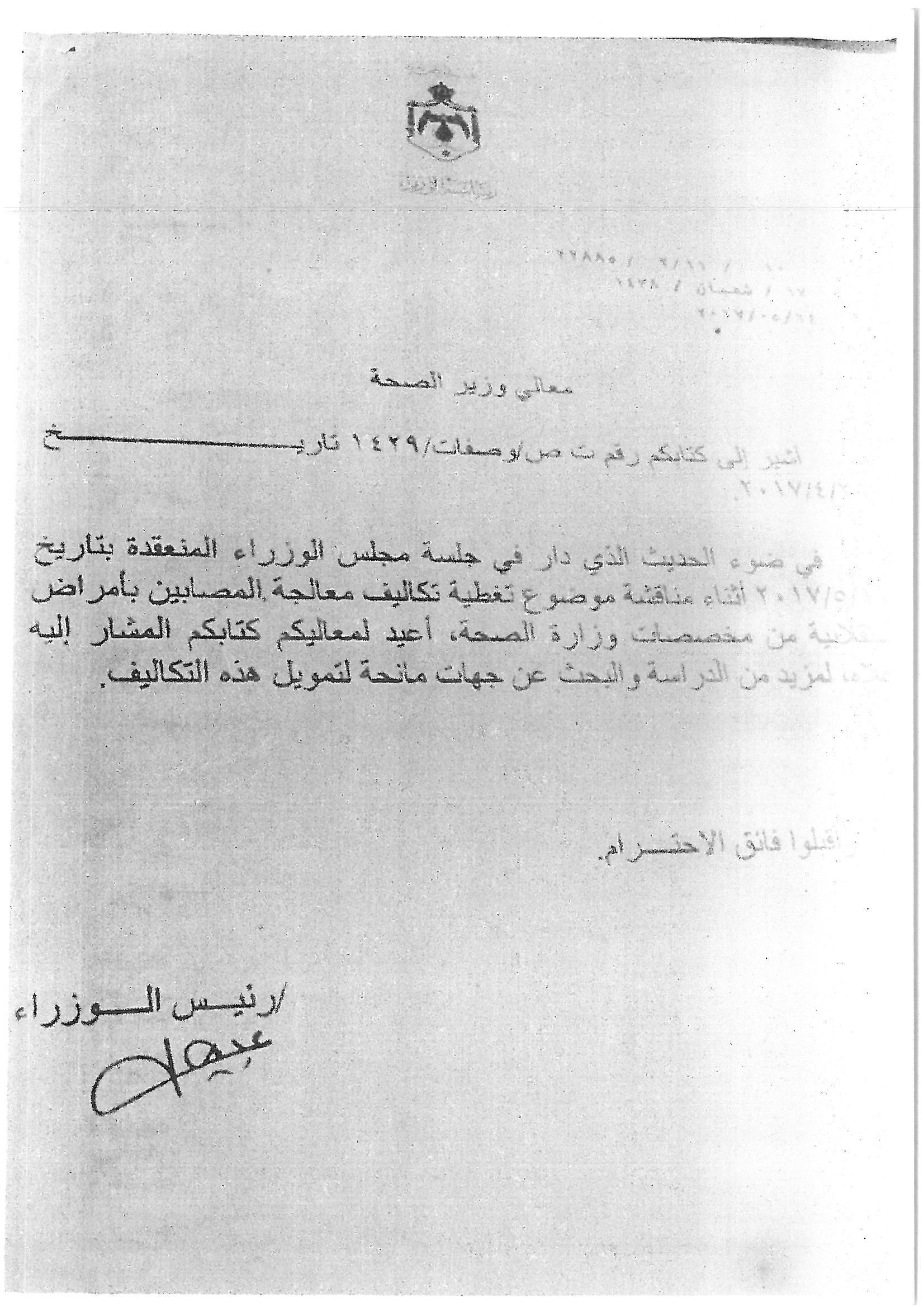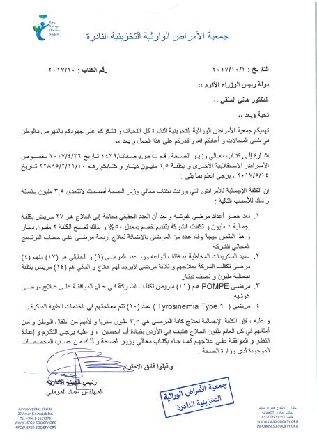 وفي إبريل/نيسان 2017 كتب وزير الصحةآنذاك محمود الشيابإلى رئيس الحكومةمطالبا بالموافقة على علاج 50 مريضا بمرض جوشر و30 مريضا بأمراض استقلابية أخرى بتكلفة اجمالية 6.5 مليون دينار سنويا. وأشار إلى أن عددا من مرضى جوشر يتلقون علاجا على حساب الشركة المصنعة التي تعرض خصما بمقدار النصف على تكلفة علاج باقي الحالات. لكن رئاسة االحكومة ردت على الوزارة مطالبة بالبحث عن جهات تمويل لتلك التكاليف. وحين كتبت الجمعية الأردنية للأمراض الوراثية التخزينيةإلى رئاسة الحكومة موضحا أن التكلفة لا تتجاوز 3.5 مليون دينار حسب تقديرات الجمعية لكن المراسلات انتهت إلى هيئة التأمين الصحي وسط حالة من الجمود.