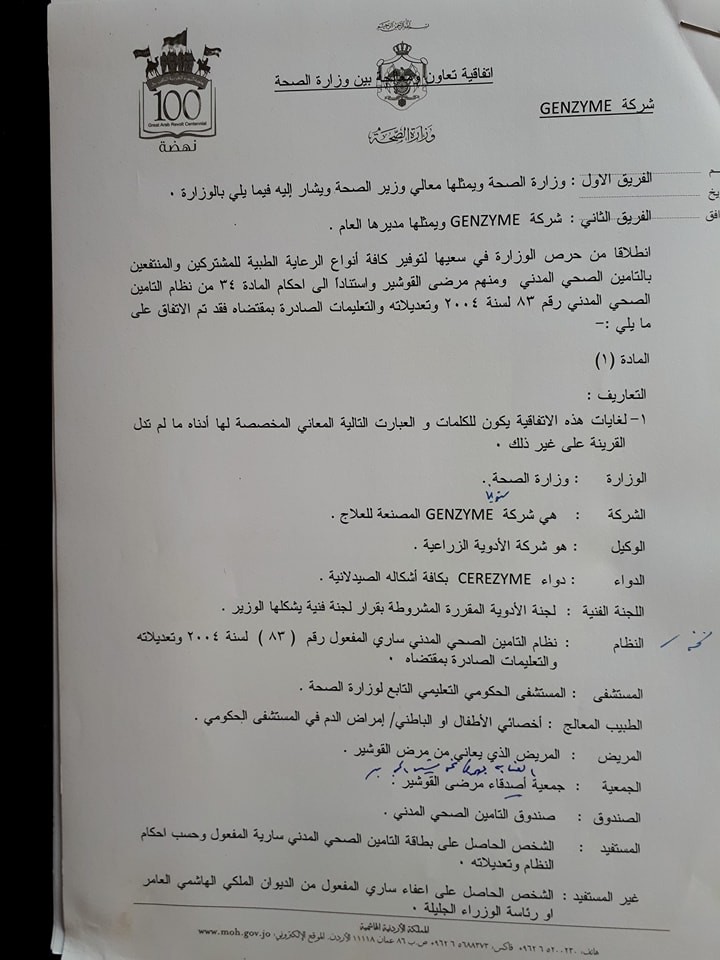 وكانت جمعية العناية بمرضى جوشر وشركة سانوفي جنزايم الفرنسية المنتجة للدواء توصلتا إلى مسودة اتفاقية مع وزارة الصحة عام 2013 تتضمن استمرار الشركةفي تحمل تكلفة علاج 17 مريضا أردنيا، وهو ما تقوم به منذ 14 عاما، وأن تقدم خصما بنسبة 50 في المئة على باقي الحالات بالإضافة إلى تدريب أطباء أردنيين على تشخيص هذه الأمراض وتوفير مختبر لعمل الفحوصات اللازمة في إطار المسؤولية الاجتماعية للشركة.