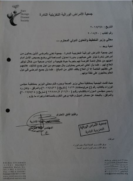 وزارة الصحة جعلت شعارها بموقعها على الإنترنت كلمة للعاهل الأردني الملك عبد الله يقول فيها إن “تحسين مستوى حياة المواطن يتطلب الاهتمام بالرعاية الصحية وهي حق كل مواطن مواطنة.” وأصحاب الأمراض التخزينية النادرة ينتظرون من الوزارة الالتزام بتلك المقولة.