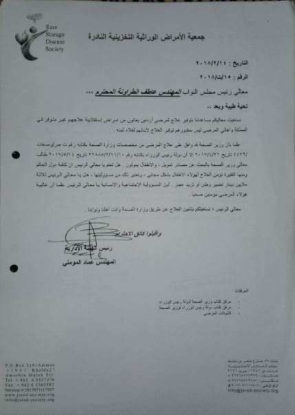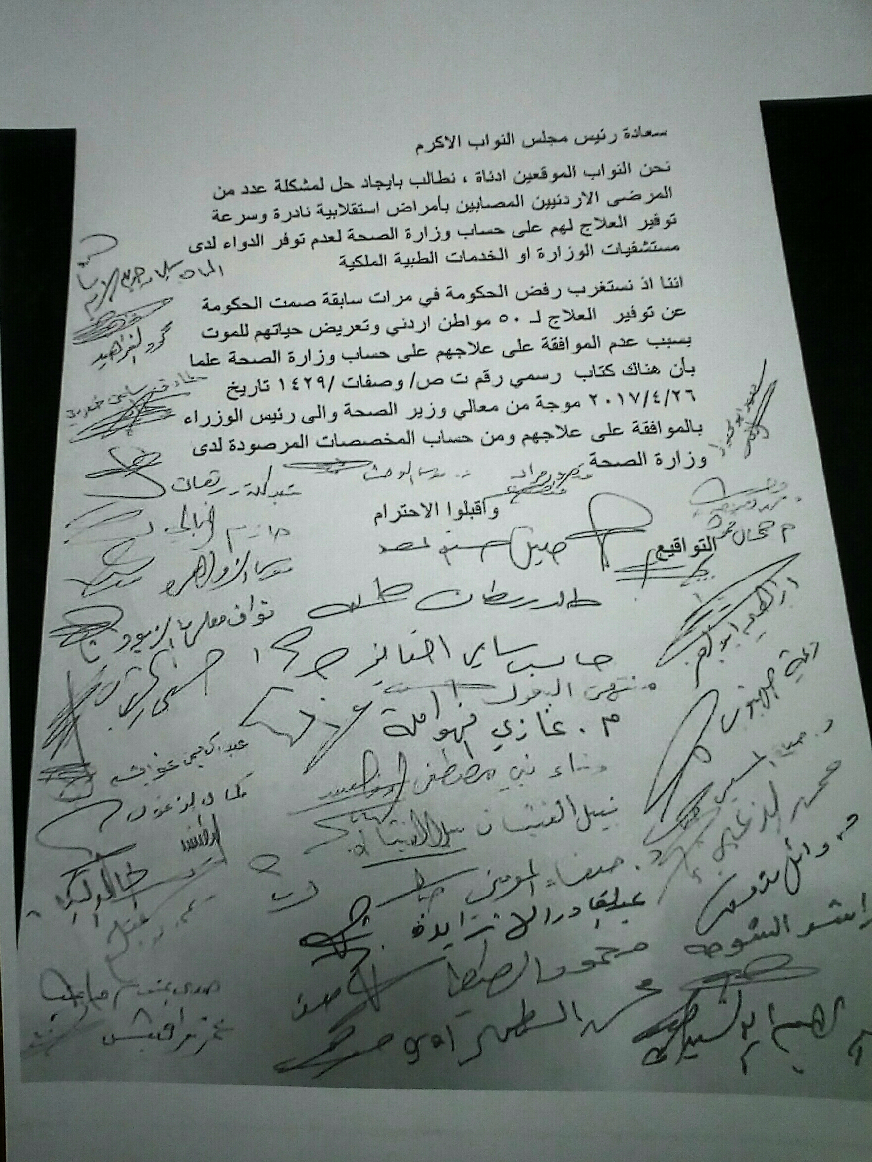 الجمعيات الأهلية لن تصفق بيد واحدة، ولذا وجهت الجمعية مراسلات إلى وزيري الصحة والتخطيط ورئيس الحكومة ورئيس مجلس النوابللمطالبة بتأمين العلاج لهؤلاء المرضى لكن دون جدوى. وفي العام الماضي، وقع 38 نائبا في البرلمان على مذكرة تطالب رئيس مجلس النواب بالعمل على حل مشكلة هؤلاء المرضى الذين قالت المذكرة إنهم 50 مواطنا أردنيا. ولم يحدث تحرك أيضا.