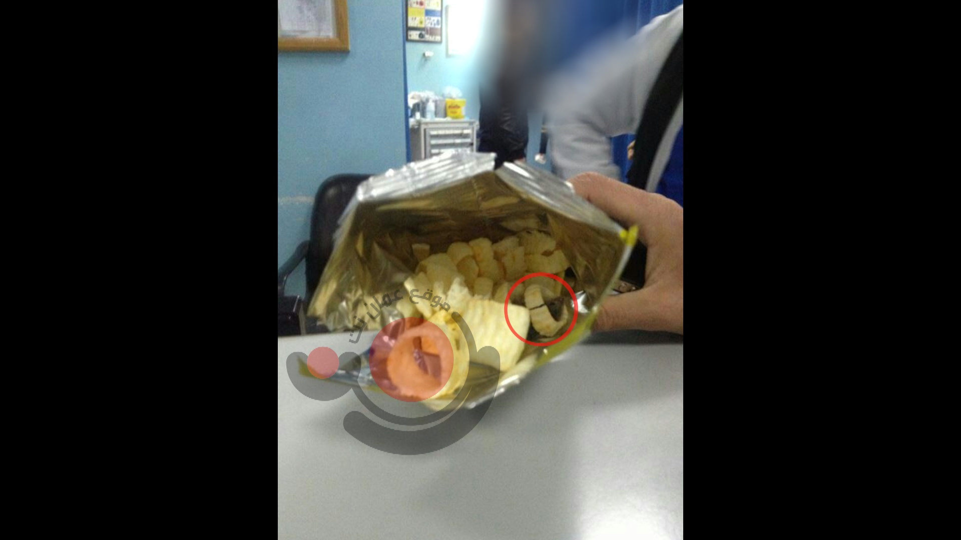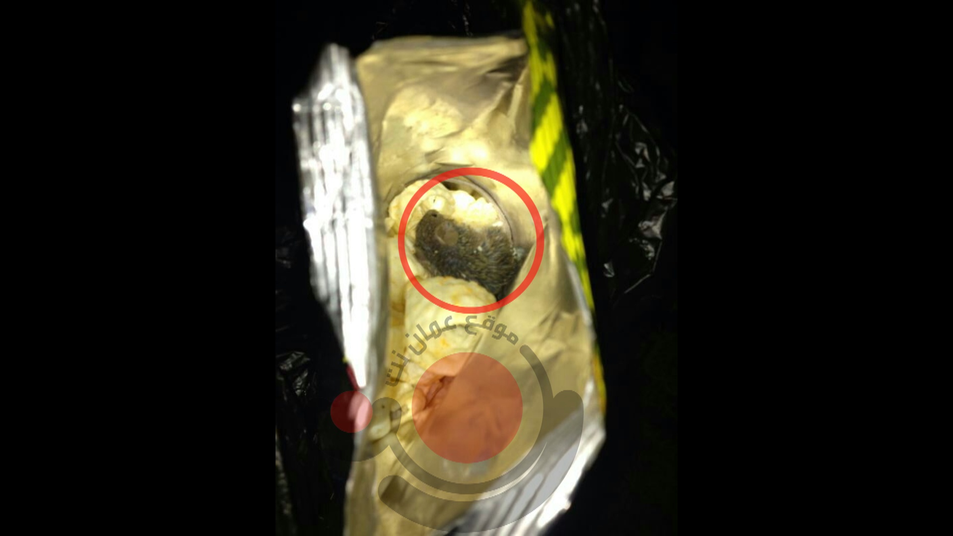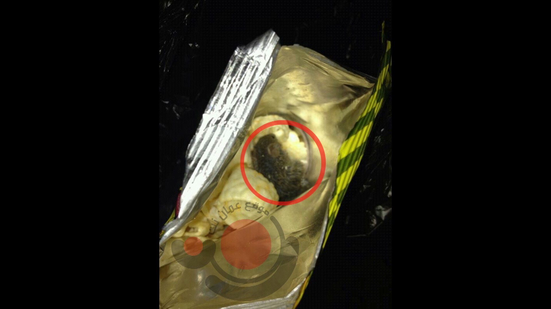عمان نت التي وصلها كيس الشيبس وبداخله الفأر، كان مثقوبا من الأسفل الامر الذي دفعنا للتحفظ على اسم المنتج لحين الانتهاء من نتائج التحقيق الذي باشرته مؤسسة الغذاء والدواء وامانة عمان لمعرفة مصدر دخول القارض هل هو المصنع ام البقالة.
