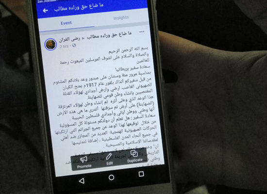 ودعت اللاجئة الفلسطينية رضى الفران، السفير البريطاني في عمان إلى تحمل المسؤولية عن كافة الجرائم التي ارتكبها الاحتلال الإسرائيلي بحق أهل فلسطين، مخاطبة السفير في رسالتها "بمناسبة مرور مئة وسنتين على صدور وعد بلادكم المشؤوم من قبل سفيركم آنذاك بلفور عام 1917م بمنح الكيان الصهيوني الغاصب أرضي وأرض أجدادي لهؤلاء القتلة المغتصبين لإنشاء وطن قومي للصهاينة".