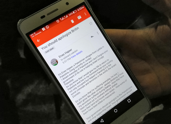 "كل يوم أحلم بفلسطين، أن أرى سماءها، وبياراتها، أعاني كل يوم، وهذه المعاناة تنتقل من جيل إلى جيل بسببكم"، هذا جزء من رسالة وصلت إلى بريد السفير البريطاني في عمان إدوارد أوكدن، من اللاجئة الفلسطينية إيناس حجير التي هجرت عائلتها من مدينة اللد في فلسطين عام 1948.