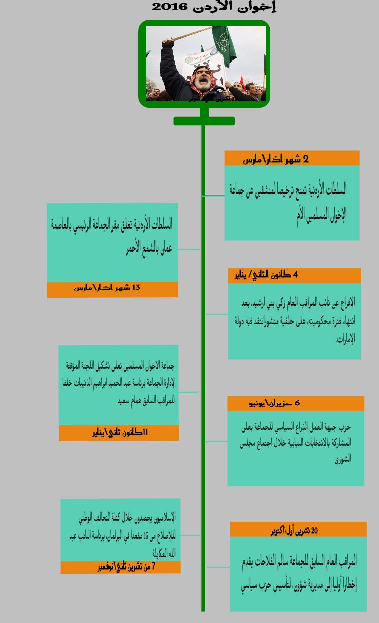 سنة صاخبة عاشتها جماعة الإخوان المسلمين في الأردن في 2016، مرحلة كان عنوانها الخلافات والإنشقاقات الداخلية، ذهابا الى في الانتخابات البرلمانية بعد مقاطعة لدورات عديدة.