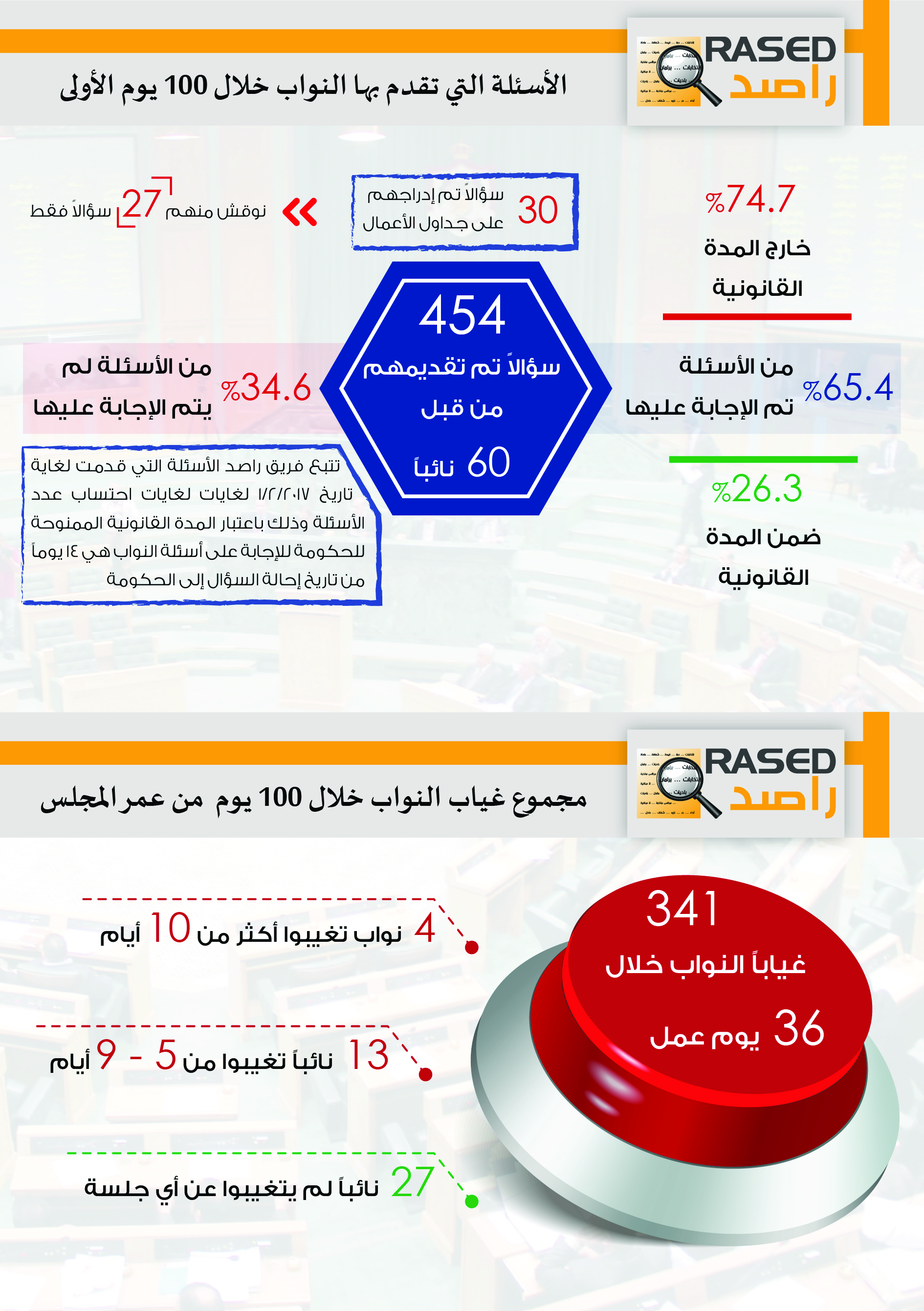 وبالرجوع إلى تقرير برنامج راصد لتقييم أداء مجلس النواب السابع عشر خلال 100 يوم الأول، فيلاحظ أن عدد الأسئلة التي تم توجيهها للحكومة بلغت 586 سؤالاً، وجهت من قبل 84 نائباً وتم الإجابة حينها عن 427 سؤالاً ما يعني انخفاضاً في عدد الأسئلة النيابية الموجهة للحكومة بنسبة 22% عن الدورة المماثلة للمجلس السابق.