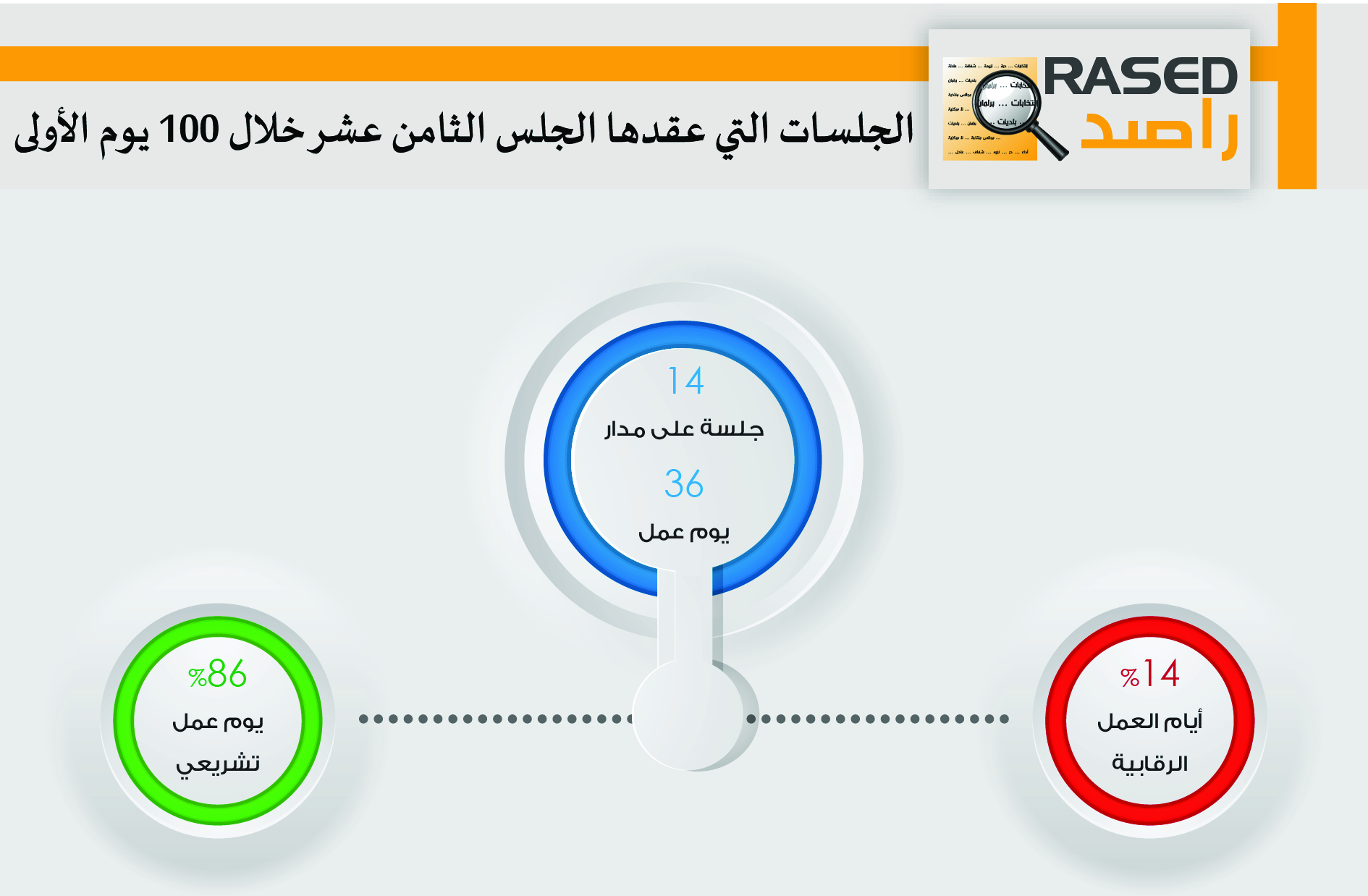ويظهر التقرير أن المجلس الثامن عشر عقد خلال المئة يوم الأولى 14 جلسة على امتداد 36 يوما عمل توزعت ما بين أيام عمل تشريعية وصل عددها إلى 31 يوم عمل وأيام عمل رقابية وصل عددها إلى 5 أيام عمل.