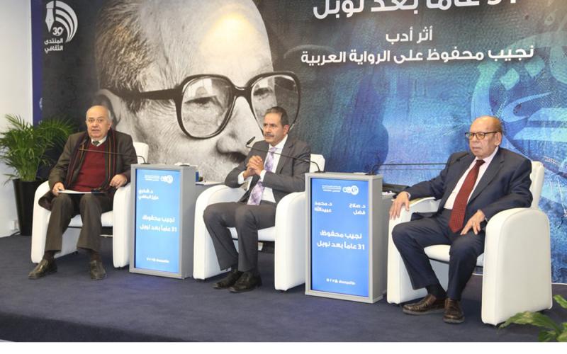 واشاروا خلال ندوة نقدية عقدت مساء امس الاثنين في المنتدى الثقافي لمؤسسة عبد الحميد شومان بعمان، بمناسبة مرور 31 عاماً على نيل محفوظ "نوبل للآداب"، الى الجوانب الإبداعية والفكرية والجمالية التي شكلت تجربة محفوظ. وقال أستاذ النقد الادبي المصري الدكتور صلاح فضل، في الندوة، ان نجيب محفوظ حول العمل الروائي إلى عمل فكري وفني، ووظف جميع الرؤى الفكرية والفلسفية والنفسية والإنسانية لخدمة العمل الروائي حتى تصبح له قيمة ومعنى. واوضح فضل، أن محفوظ طور نفسه مع العمل الروائي من الكلاسيكية إلى التجريبية إلى التعبيرية، وبالتالي لم يقف مع الرواية عند حد أو زمن أو فكرة معينة بل كان يتجدد دائما وتتجدد معه رواياته.