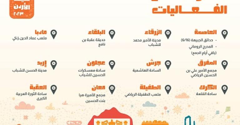 تبدأ فعاليات مهرجان صيف الأردن 2023، بعد غد الجمعة، وتستمر حتى الخامس والعشرين من آب المقبل، إذ يتضمن المهرجان فعاليات منوعة مخصصة للعائلات والأطفال، ابتداء من الساعة 6 مساء. وستقام الفعاليات أيام