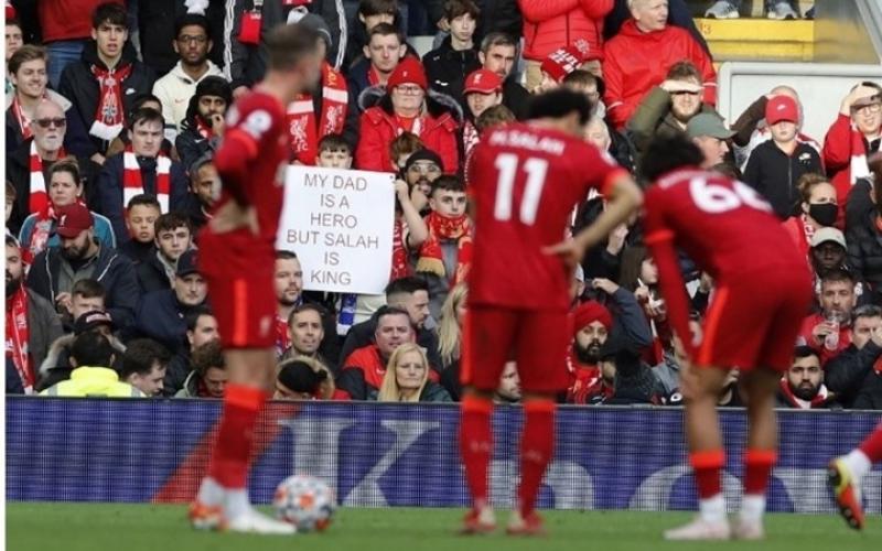 ورفع الطفل الصغير لافتة في المدرجات مكتوب عليها: " أبي بطل، لكن صلاح ملك".