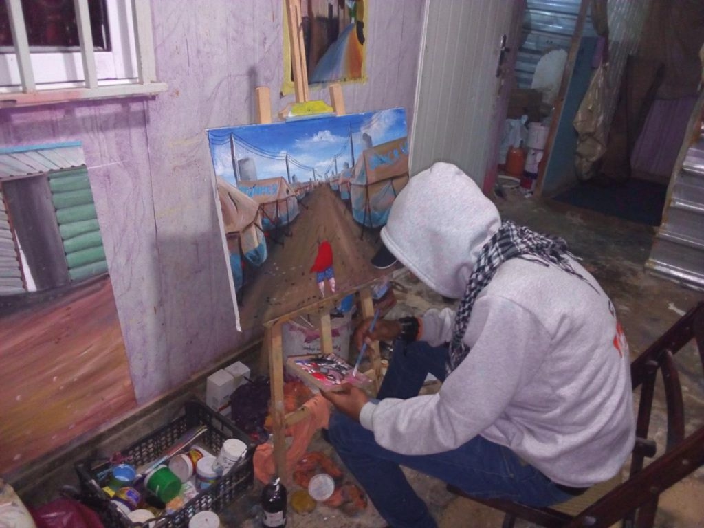 يمضي الحمد معظم أوقاته، بين جدران كرفانته الحديدية بغرفة ضيقة أمام لوحاته التي يرسمها بريشته، والتي تجسد “الواقع المرير” الذي يمر به اللاجئين في مخيم الزعتري بلوحات فنية عميقة التصوير.